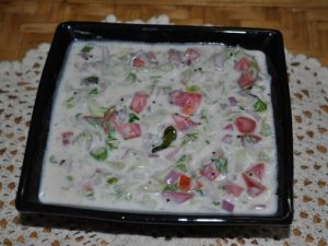 Raw vegetables in curds/yoghurt. Cuisine: Indian Time Required: 20 Minutes Ingredients: 1 Cucumber 1 Onion 1 Tomato 3 Cups Curds/Yoghurt…