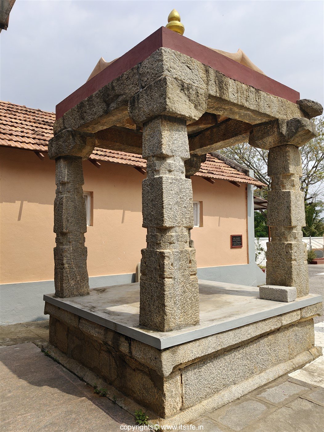 A Tulasi (sacred basil) Brindavana is constructed near the Garuda khamba and it is believed that if you circumambulate the Brindavana 256 times, your wishes will be fulfilled.