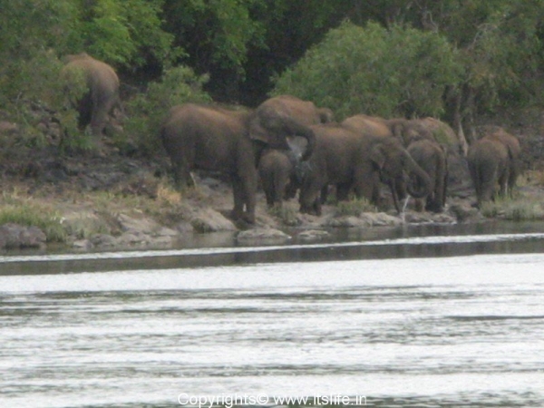 As we sat soaking in the silence and beauty of the place we heard elephants trumpeting from the opposite bank. We sprang to our feet and 6 pairs of eyes scanned to catch a glimpse of the elephants but were greeted with silence interrupted by the gurgle of the river. After about 15 minutes, we were treated to a wildlife encounter deserving a standing ovation! On the opposite bank was a herd of 20 or more elephants comprising of male, female and baby elephants walking towards the river. They started drinking, spraying water on themselves and others and few started rolling in the water. This spectacular show ended after 15 minutes as the leader lead them back into the forests trumpeting their exit. The forest officials themselves were surprised and said we were lucky to have witnessed this, as it is very rare to come across such a big herd. I only wished that we had more powerful cameras.