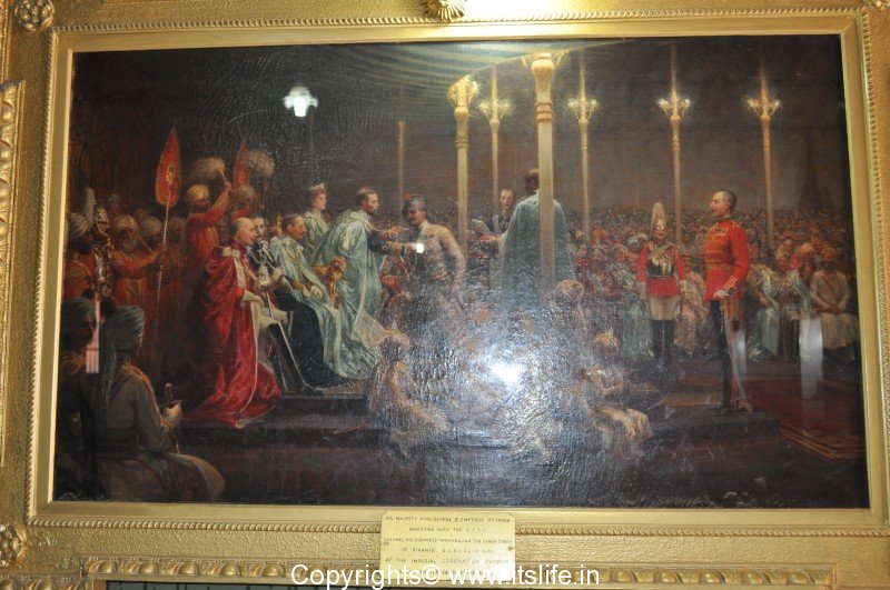 His Majesty King George V, Emperor of India investing the G.C.S.I. to colonel his highness Maharaja Sir Ganga Singh of Bikaner at the imperial coronation durbar in Delhi on the 14th December 1911.