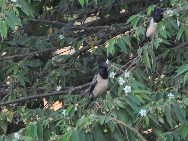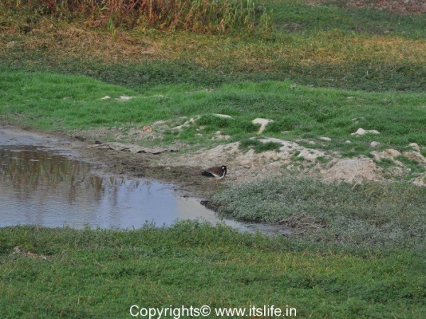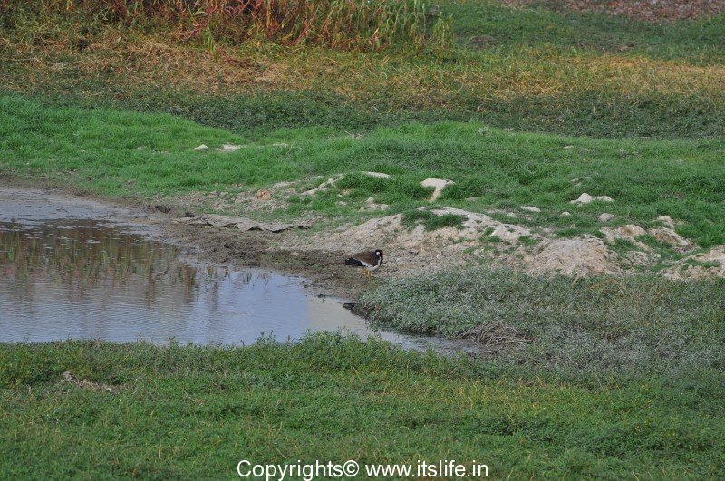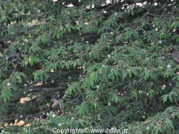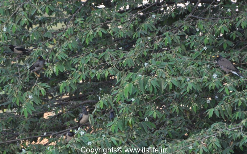The bed of the lake is dry but you can find dozens of Jungle Myna, Common Myna, and Rosy Starling pecking at something they have found delicious.