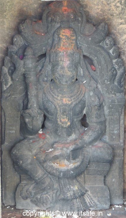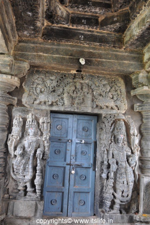 The sanctum sanctorum (garbhagriha) is facing the east. The door to this is guarded by two dwarapalakas (door men).