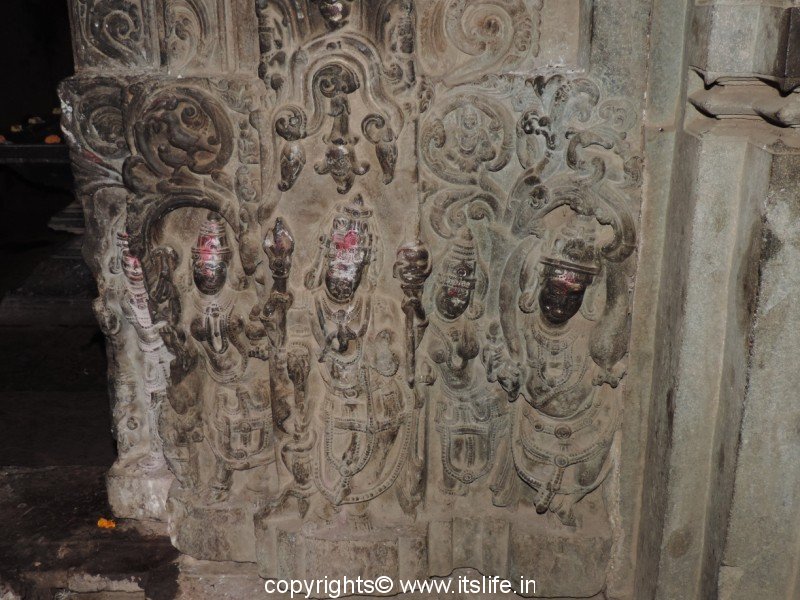 Beautiful decorated granite pillars with sculptures are present in the temple. The walls are also have carvings.