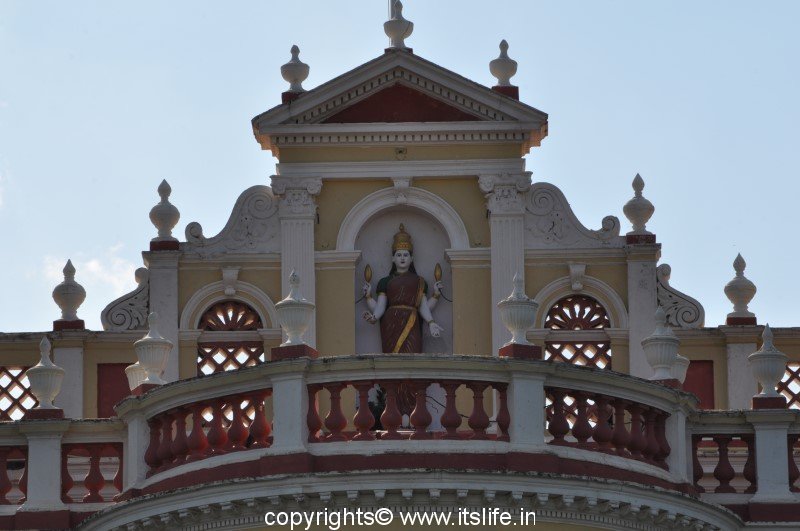 Typical of Mysore architecture, the top of the building elevation has a small prabhavali (arch) made in concrete with goddess Lakshmi installed inside. This is seen in most of the heritage buildings in Mysore.