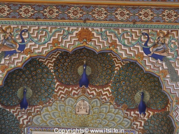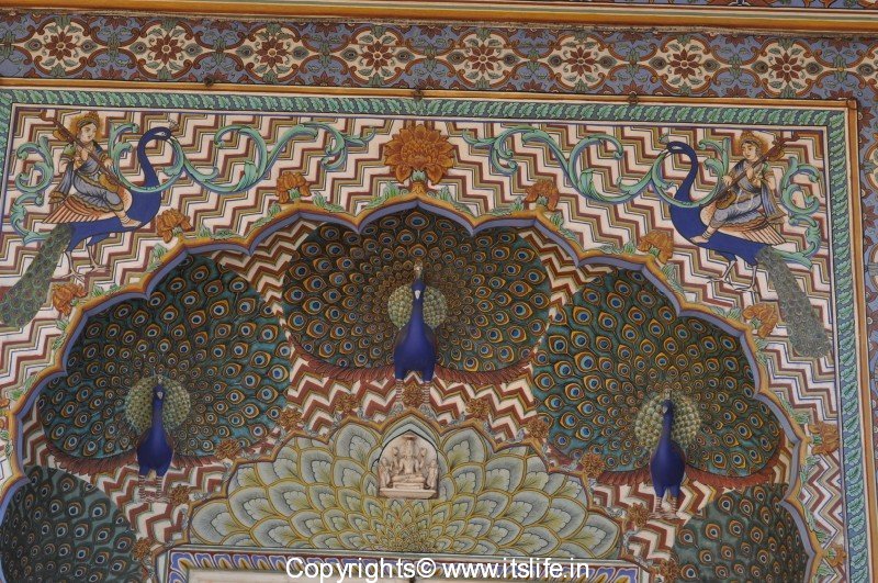 The enclosed inner courtyard, leading to Chandra Mahal is known as Pritam Niwas. I loved this courtyard and spent a lot of time admiring the four gates, each door decorated with polychrome inlay to represent a season. The Peacock gate represents spring, the Lotus gate summer, the Leheriya gate monsoon, the rose gate winter.