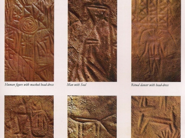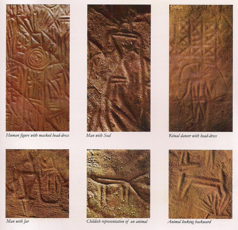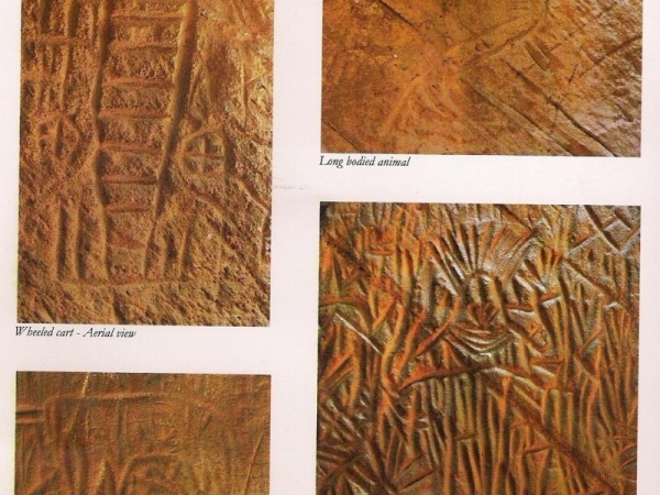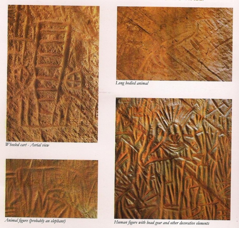 The carvings are that of humans, animals, tools, symbols, trees, wheels, carts, letters, numeric signs.