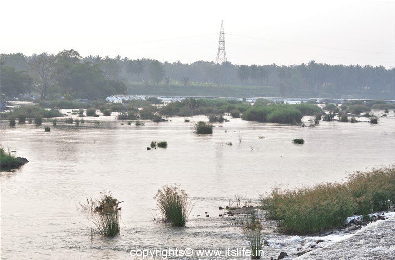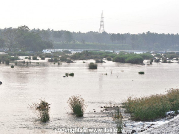 A check dam is built on the Cauvery River creating a water falls. Many birds are seen flying around this place.