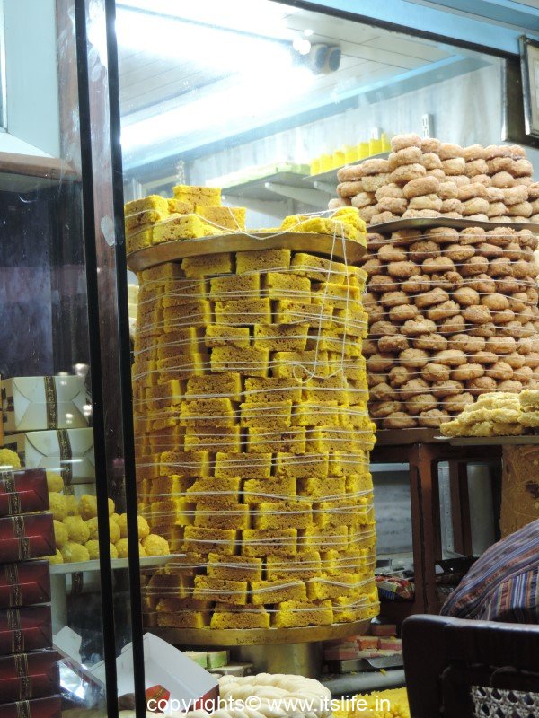At the periphery of the Devaraja Market were many shops again selling various items from audio cassettes, greeting cards, wallets, belts, sarees, cosmetics, footwear, women clothing, and in one corner was the “show stopper”. This quaint shop was/is open on both sides and the shop is stacked with the most sought after royal sweet called the “Mysore Pak”.