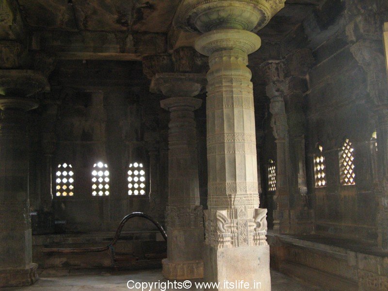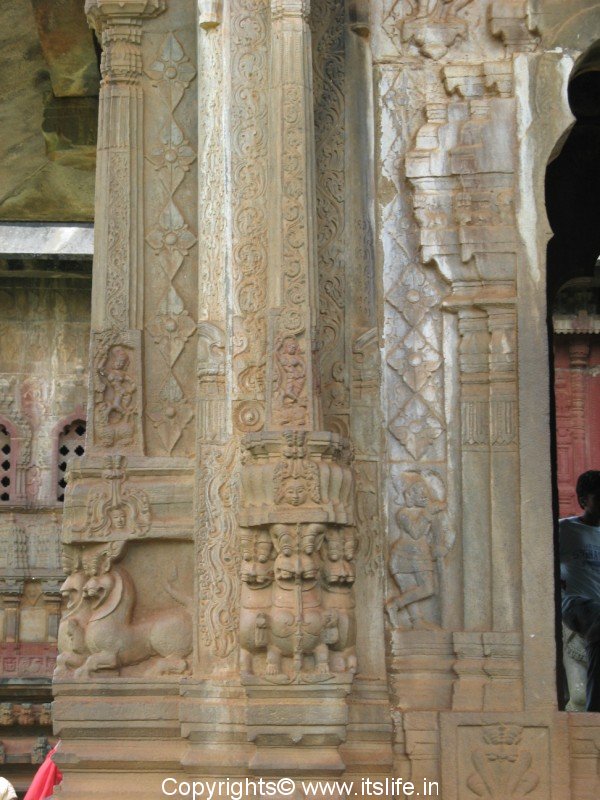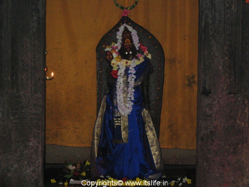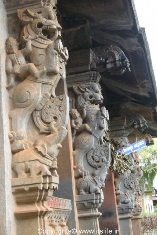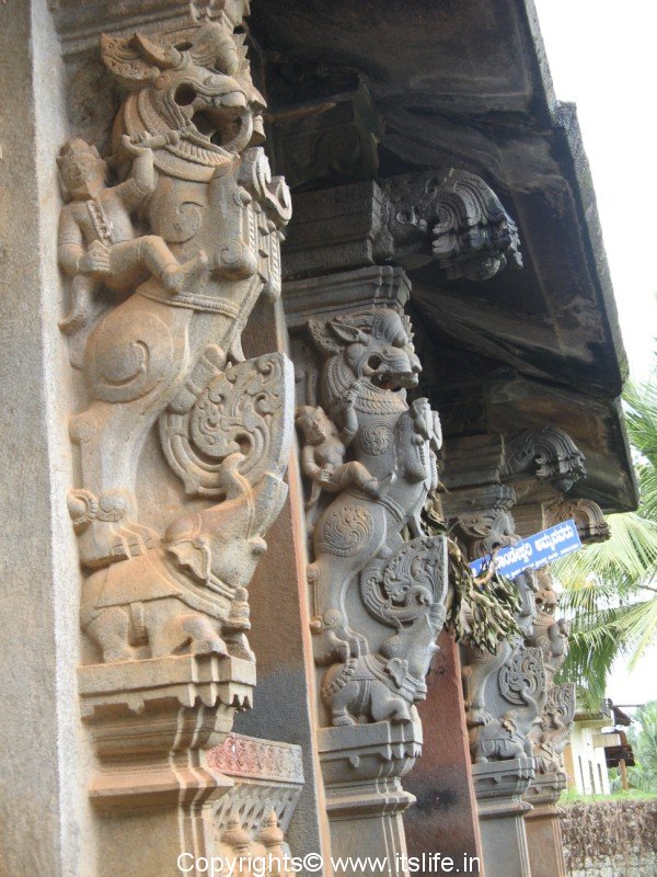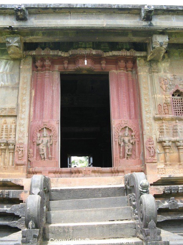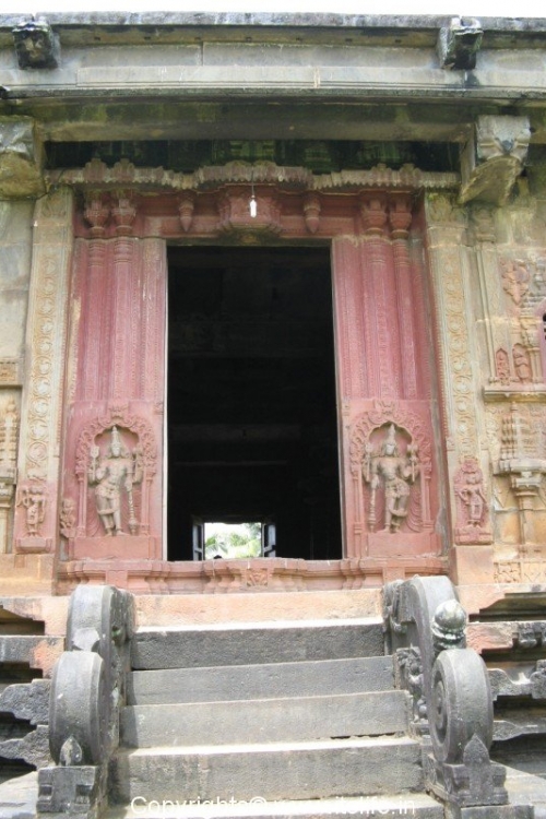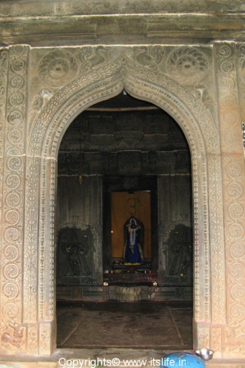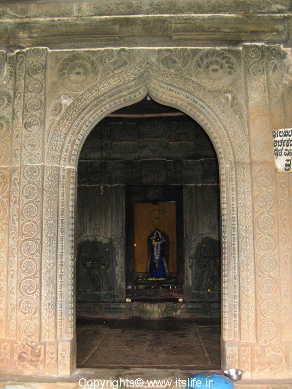 The stone doorway is carved and shaped beautifully to complement the idol. There are some sculpted stone pillars of that of a mythological animal being ridden by a human.