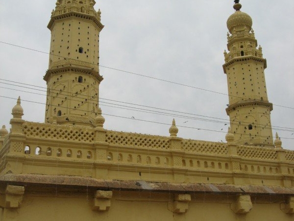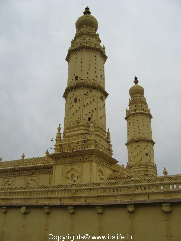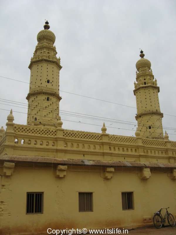 The Jamia masjid (mosque) is huge and built in Hindu and Islamic architecture. Jamia Masjid Srirangapatna consists of an open court, a covered verandah and two minarets. The minarets are very attractive with exquisite floral cornices and parapets and can be seen from the highway as well as from Karighatta hills. The octagonal shaped minarets are two stories surmounted by domes. A flight of 200 steps inside the minarets, takes the visitors to the top for a fine view of Srirangapatna.