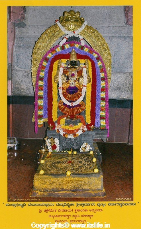 The Sri Yantra is differently installed and carved than the Sri Chakra. The Sri Yantra has the mantras carved all around the stone giving out positive energy inside the temple and all around it.