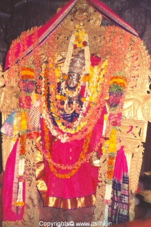 The temple complex is surrounded by a large exterior wall almost like a fort. There are stone porticos inside the temple attached to this exterior wall. The temple inside is divided into Natya Mantapa / Dance Hall, Mukha Mantapa / Main Hall, Artha Mantapa (intermediary space between the sanctum sanctorum and the temple exterior) and Garbha Gruha / Sanctum Santorum. The dance hall consists of 100 pillars with figurines in various dancing poses carved on the pillars. The central dome of the hall rises upto 20 feet in the shape of a lotus. The presiding deity Veerabhadra is a black granite idol, which is almost 6 feet in height is installed in the garbha gruha and in the main hall the presiding goddess Durga / Parvathi is installed.