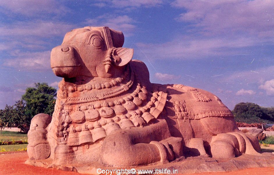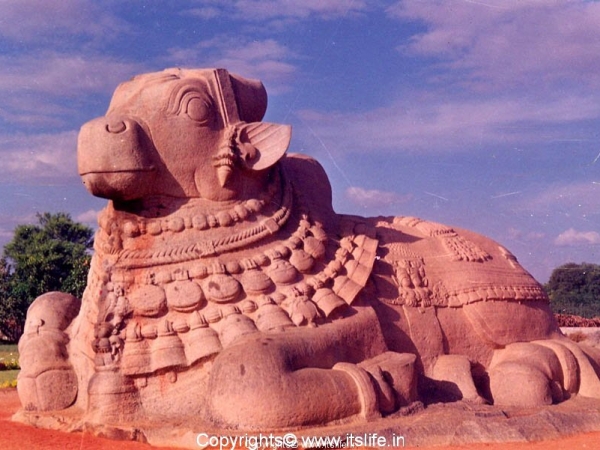 A kilometer away from the temple is the monolithic statue of Nandi, which is the largest in the world. From the Naga Linga pedestal the Nandi is visible and vice versa. At 6 pm, flood lights on the Nandi makes it look surreal.