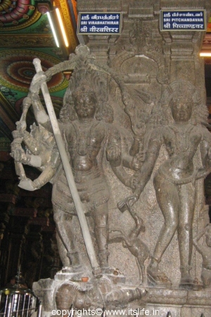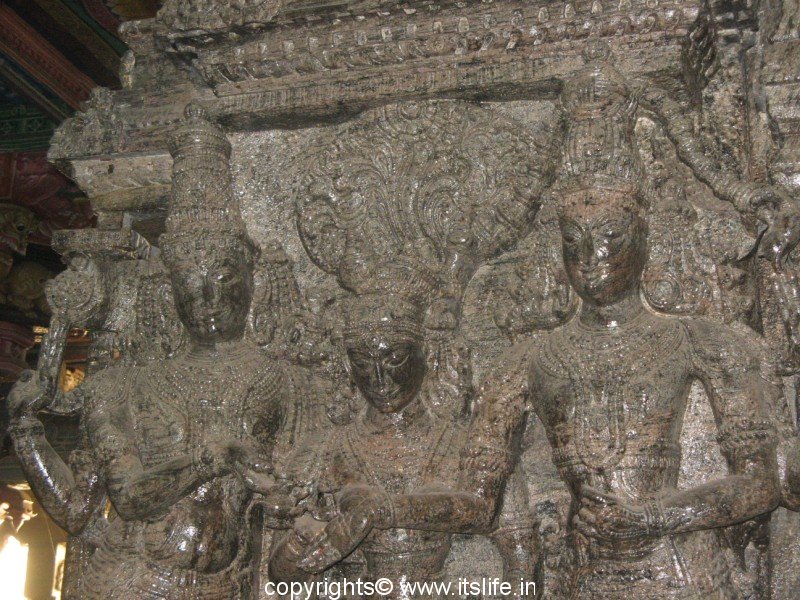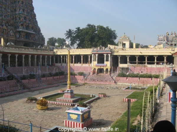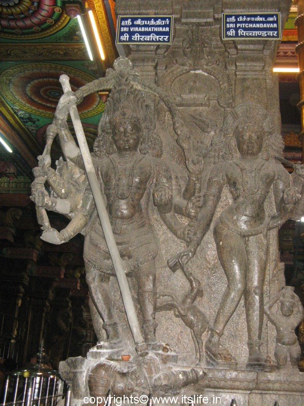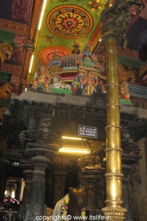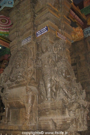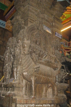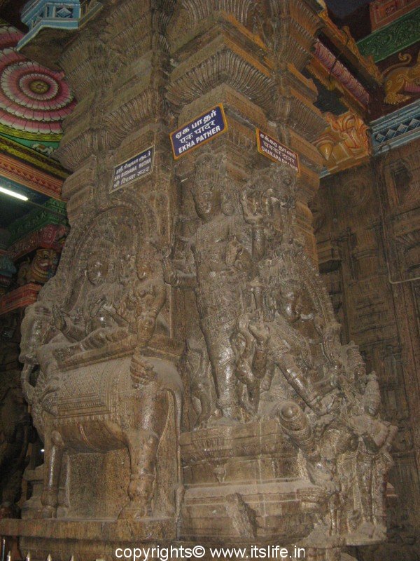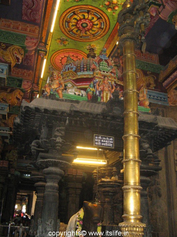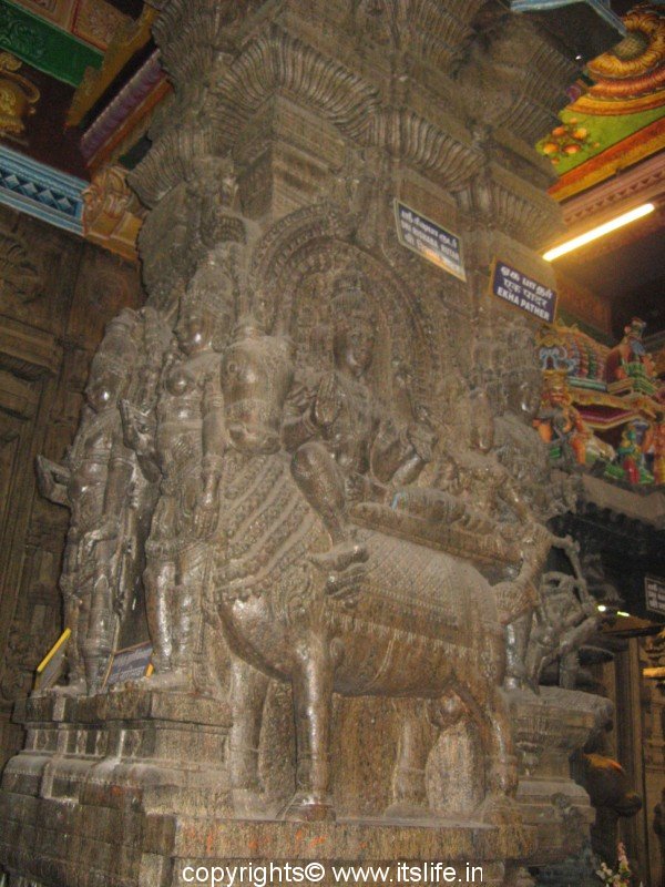The Kambatadi Mandapam (hall of temple tree) has a seated Nandi (sacred bull and vehicle of Lord Shiva). Pillars surrounding the Nandi is carved with Shiva in various forms. The most famous and much loved is the sculpture depicting the marriage of Meenakshi.