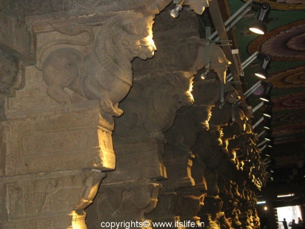 This astounding hall was built by Ariyanatha Mudaliar in 1569 and is an artistic delight. Ariyanatha Mudaliar was prime minister and general of Viswanatha Nayak, the first Nayaka of Madurai (1559–1600).