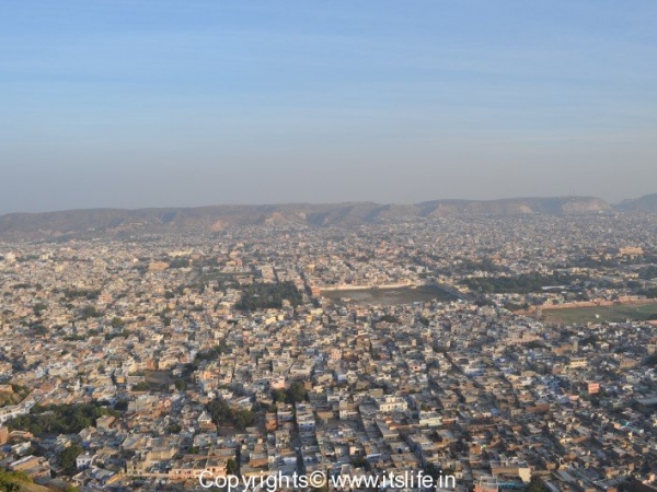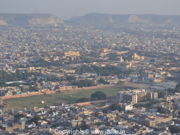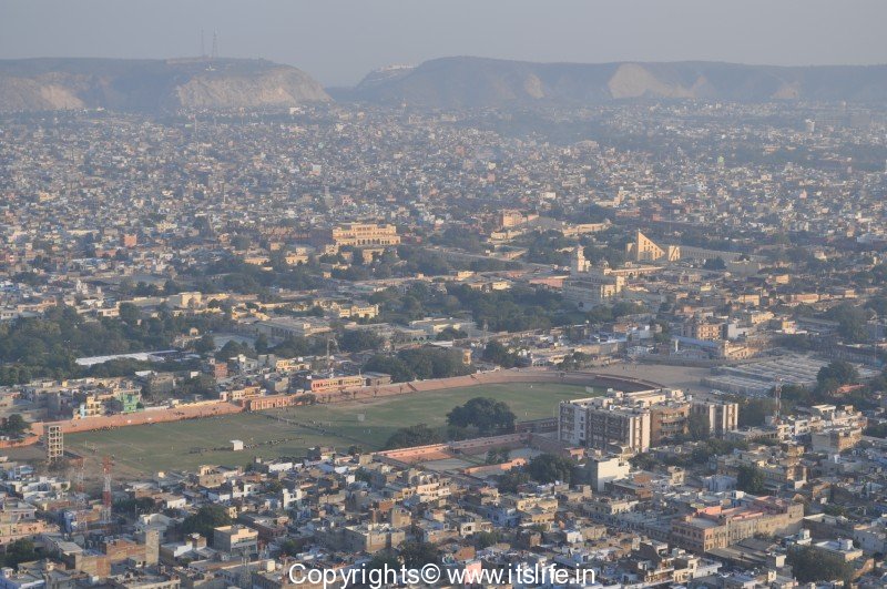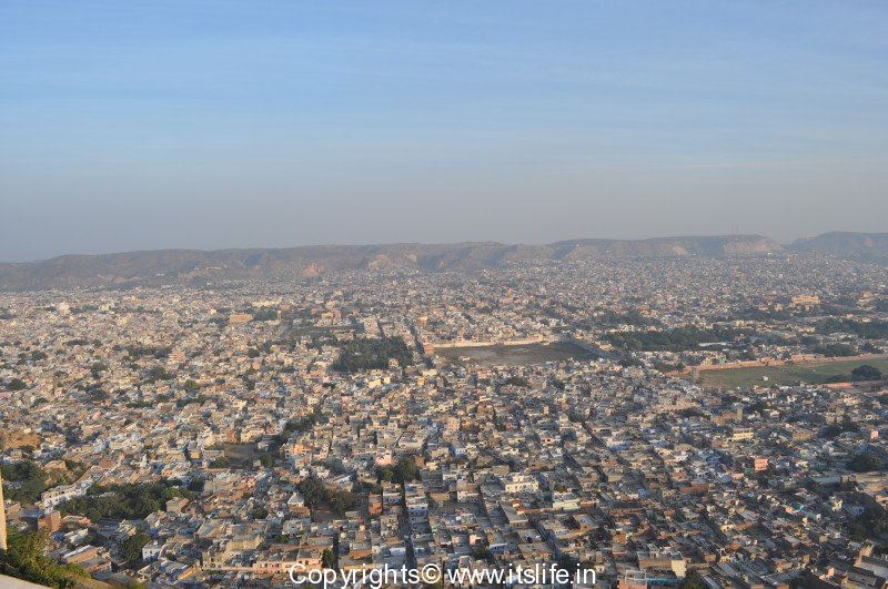 The view of Pink city is the best from this fort. On a clear day, Jantar Mantar, City Palace, Race Course are visible from the hill. You can see these in the picture below.