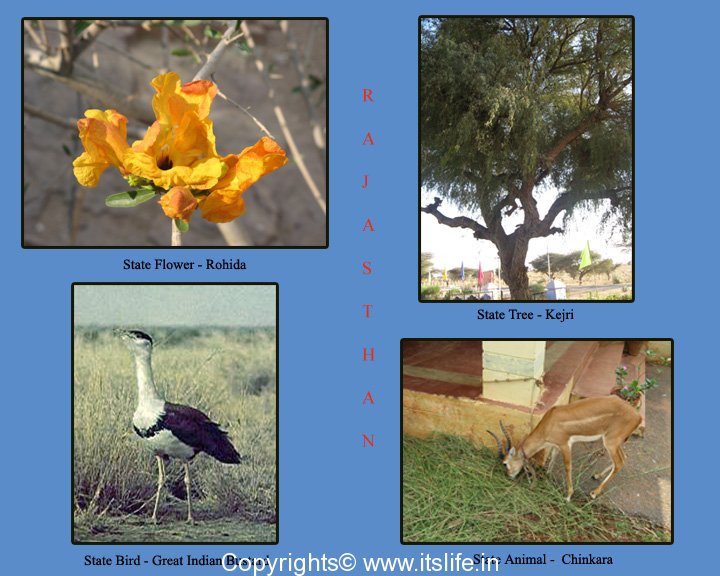 The state flower is Roheda, state tree is Kejri, state bird is the Great Indian Bustard and state animal is the Chinkara / Indian Gazelle.