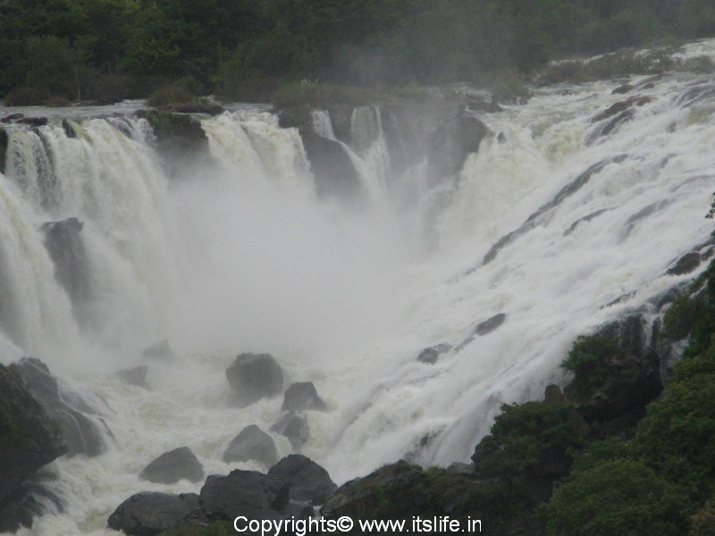 Gaganachukki falls from a height of 100 meters or more and cascades with force and elegance on the rocks resulting in huge sprays of water dashing on the rocks on either side. The gorge formed by this waterfall at the bottom is in the shape of a horseshoe. There is a watchtower on the eastern side of the falls and on the western side is the tomb of Muslim saint Phir Ghaib.