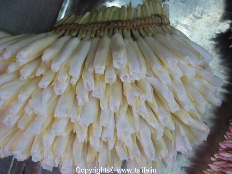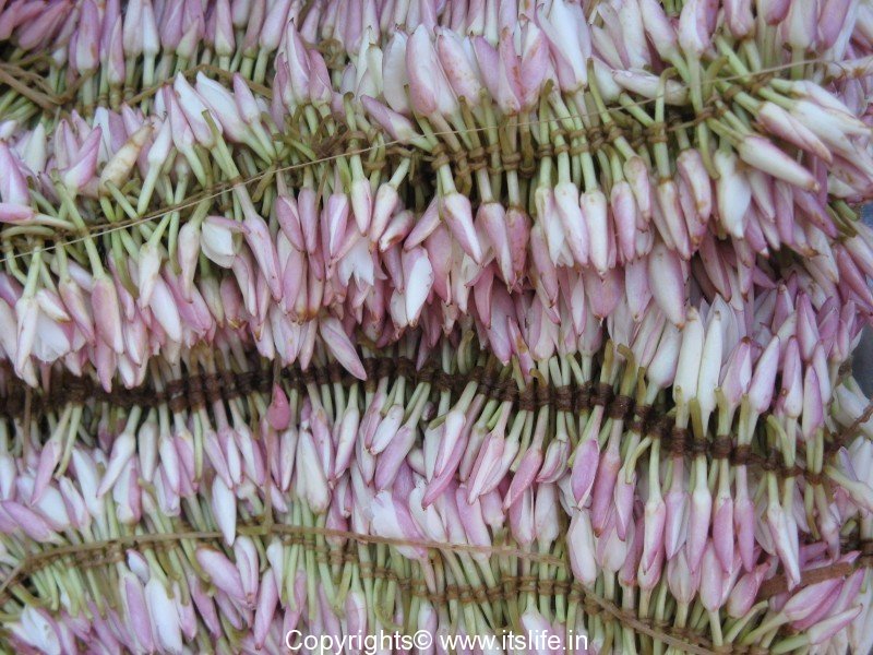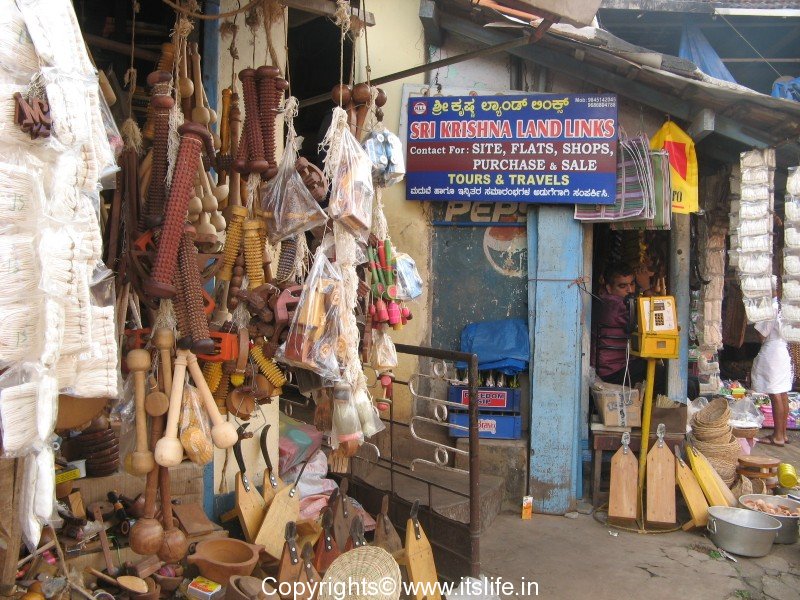 The shops sell Lord Krishna statues, Wooden Kadagolu (butter churners), Mangalore Jasmine garland, Jaji hoovu garland, Surali flower garland (Butterfly Ginger flower), Peacock feather, Rosaries, Agarbathi stands, traditional indoor games, wicker baskets, acupressure items, and Pooja items.