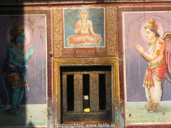 The idol faces west against the norm of facing east. During the tenure of Sri Vadirajaru as the peethadipathi (pontiff) of the matha, Kanakadasa was denied entry into the temple due to his low-caste status. Kanakadasa would stand near a window in the west and pray to the lord with great devotion, the pleased lord turned to the window where Kanakadasa was praying and provided him the denied darshan (vision). Sri Vadirajaru realized the depth of bhakthi (devotion) of Kanakadasa and the idol was retained facing the west window.
