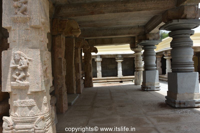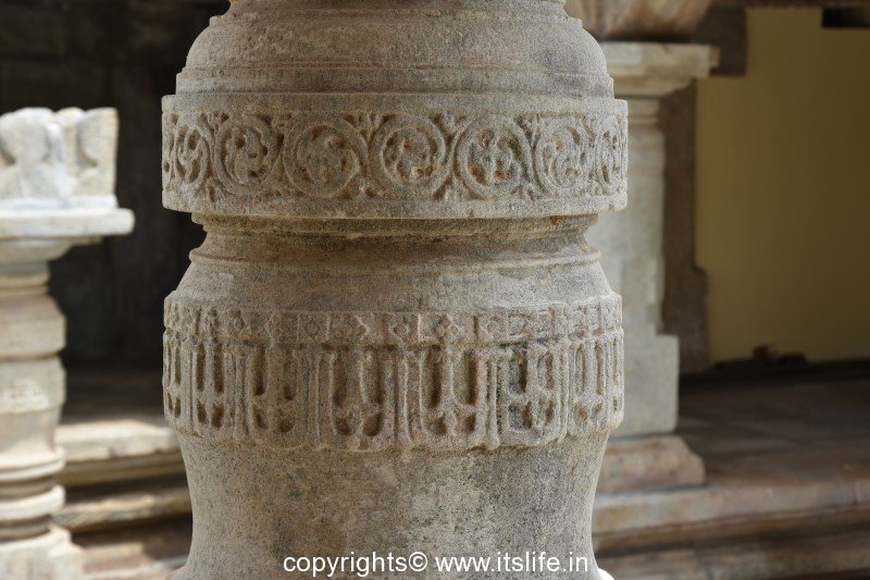 There are four pillars in Hoysala style. A sculpture where a man emerging from the mouth of the Crocodile is eye-catching.