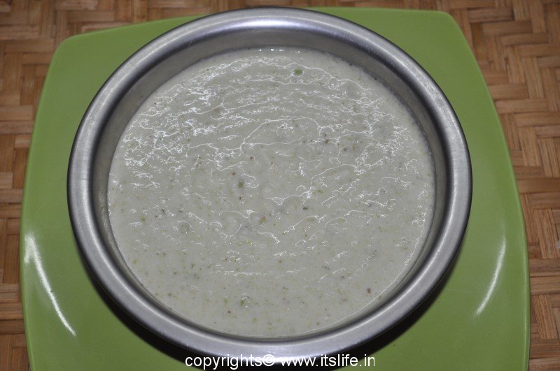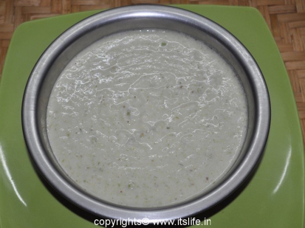 Soak Urad Dal for 3 hours. Grind it to a batter. Add Idli Rava to the batter and mix well. Add water if required. Keep it aside for 6 to 7 hours.