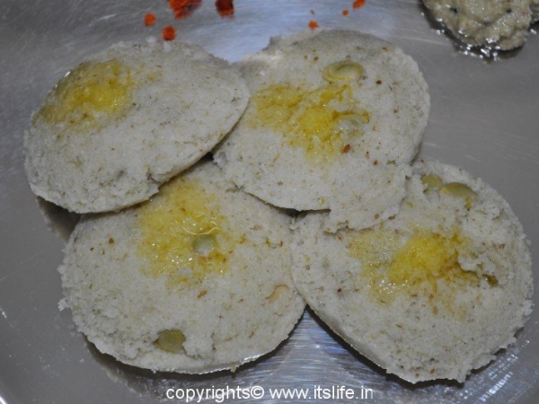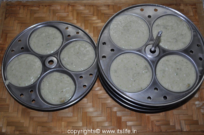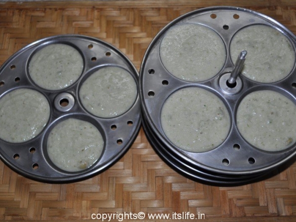 Pour the batter into Idli molds. Steam in a cooker for 10 minutes.