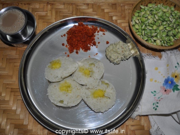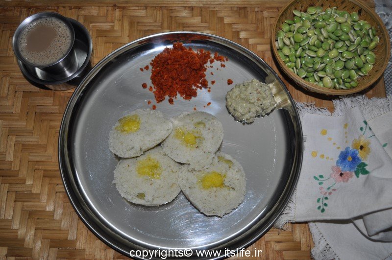 Avarekayi Idli is steamed rice cakes with flat beans also known as winter beans.