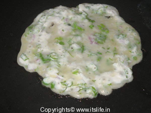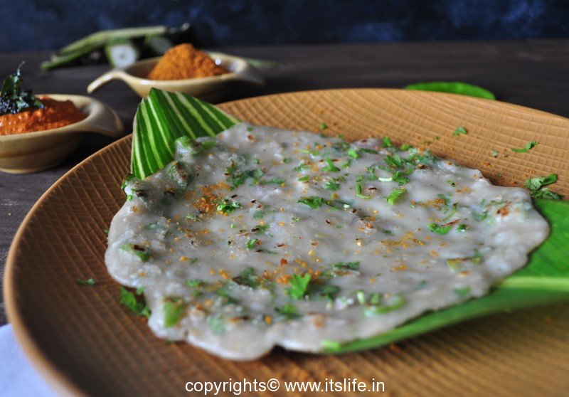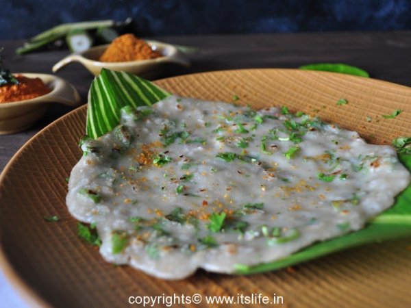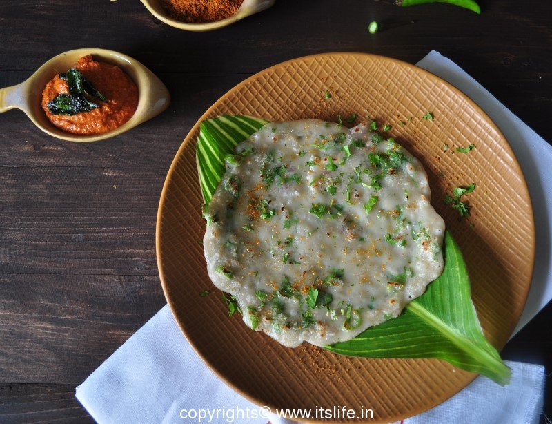 Soak Rice for 4 hours. Peel the Banana and dice them. Grind Rice, Banana and Salt to a batter. Add Green Chilies, Onion, Coriander Leaves and mix well.