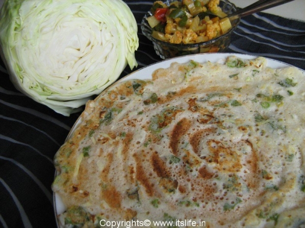 Soak Rice, Urad Dal, Methi, Tuvar Dal in water for 4 hours. Grind them together to a batter and leave it for 8 hours to ferment. Add Cabbage, Green Chilies, Coriander leaves, Curry leaves, Asafetida and Salt to the batter and mix well. Heat a griddle and pour a ladleful of batter and spread it in a circular shape. Sprinkle Oil and roast on both sides. Serve hot Cabbage Dosa with Chutney.