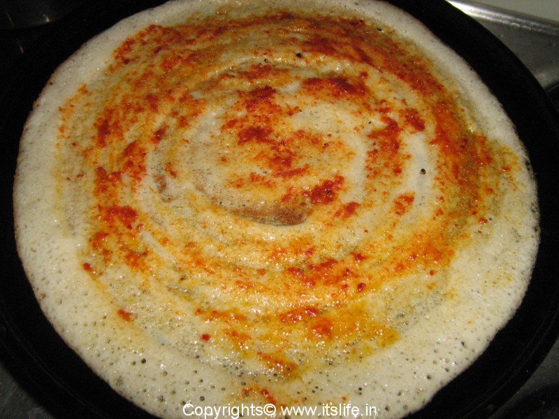 Heat a flat tava/griddle and grease it with a teaspoon of Oil. Take spoonful of the batter and spread it quickly on the tava/griddle in concentric motions using the bottom part of the spoon as shown in figure below. Spread a spoonful of Garlic Chutney on the Dosa.