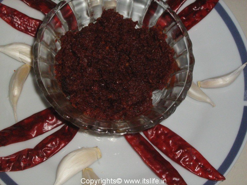 Soak Red Chilies for 45 minutes. Grind all the ingredients together except for Oil to a paste. Heat Oil in a kadai/pan and add the paste to it and stir until all the moisture evaporates. Remove and let it cool. Store in airtight jars.