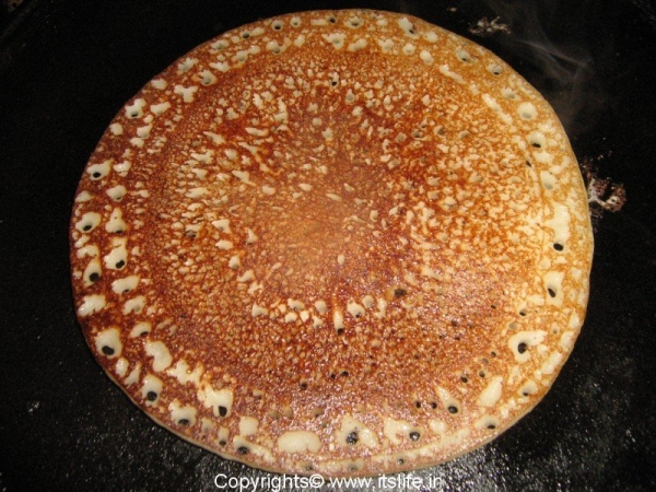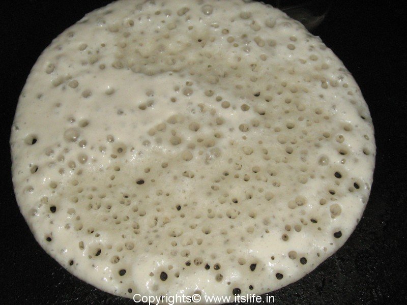 Soak Rice, Urad Dal, Methi and Bengal Gram for 5 hours. Soak Avalakki 10 minutes before grinding. Grind Rice, Urad Dal, Methi, Avalakki, Cooked Rice and Bengal Gram to a batter. Leave the batter to ferment for at least 6 – 8 hours. Add Sugar and Salt to the batter and mix well. Heat and grease a griddle and pour a spoonful of batter thickly in a circular shape shown in Picture1.