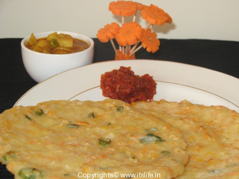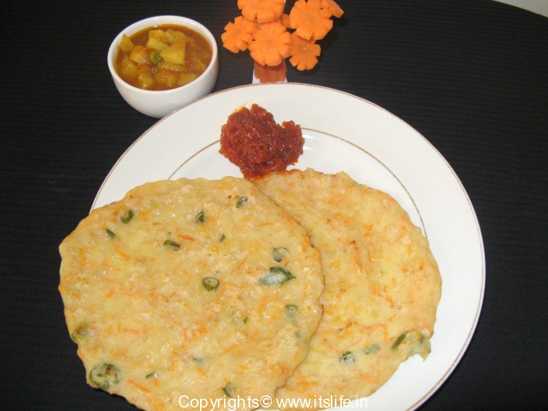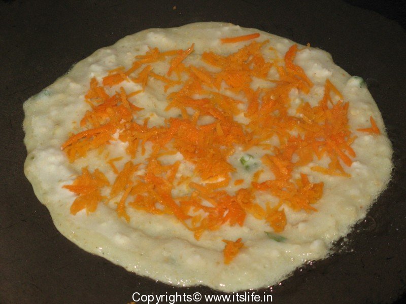 Heat a griddle and pour a ladleful of batter and spread in a concentric circle. Spread some grated Carrot over the Dosa, drizzle with Oil and roast on both sides. Serve with Sagu or Chutney.