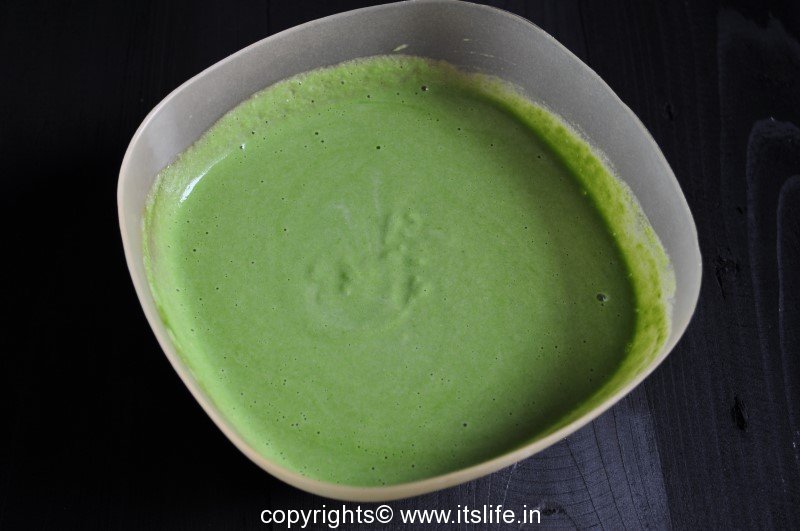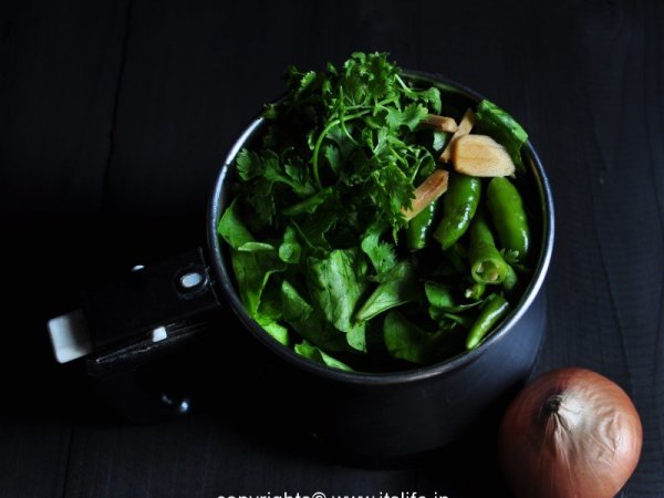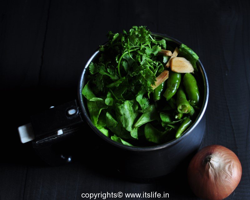 Grind Palak, Onion, Green Chilies, Coriander leaves and Ginger to a paste.