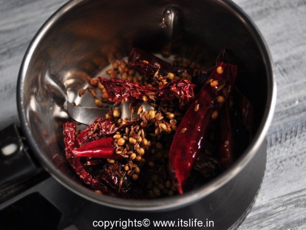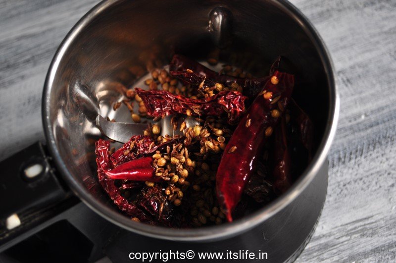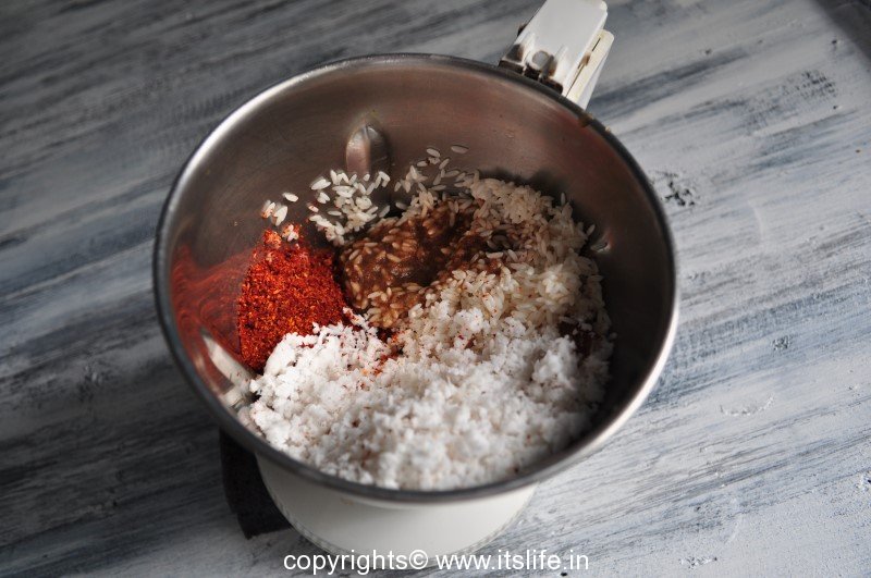 Soak Rice for 4 to 5 hours. Heat 1tsp Oil and fry Red Chilies, Coriander Seeds and Jeera.