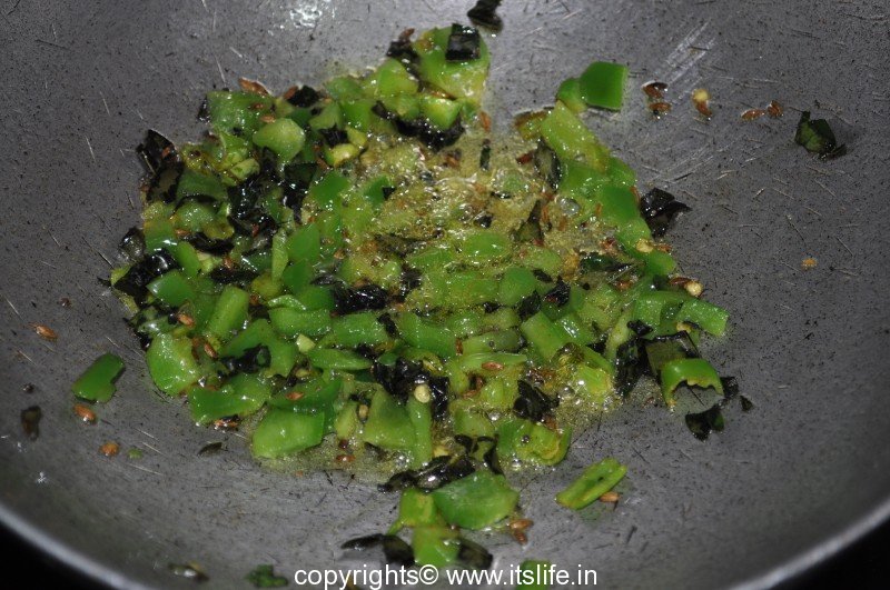 Heat Oil, add Jeera and Mustard Seeds, when they splutter, add Turmeric Powder, Curry leaves, Green Chilies, and Capsicum and stir.