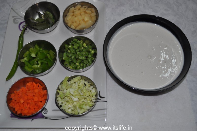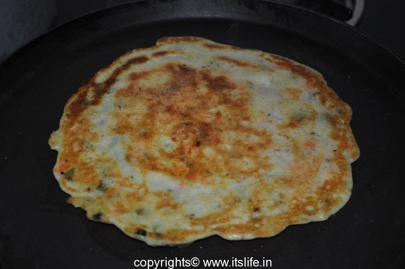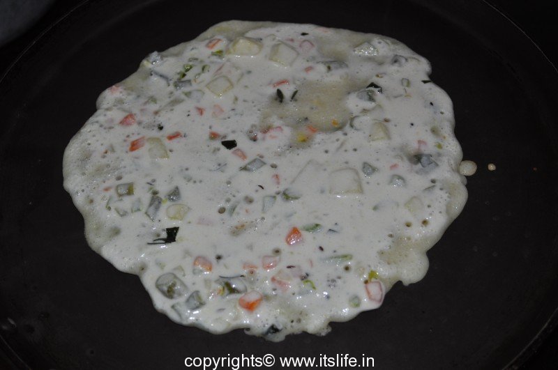 Add the Vegetable mixture to the Dosa Batter and mix well. Heat a Tava and pour a ladleful of Batter and spread to form a concentric circle.