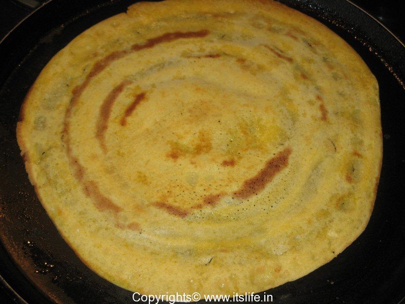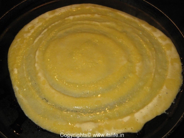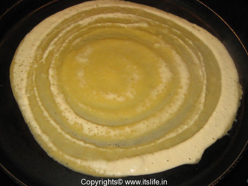 Heat a Tava and pour a spoonful of batter and spread in a concentric circle.