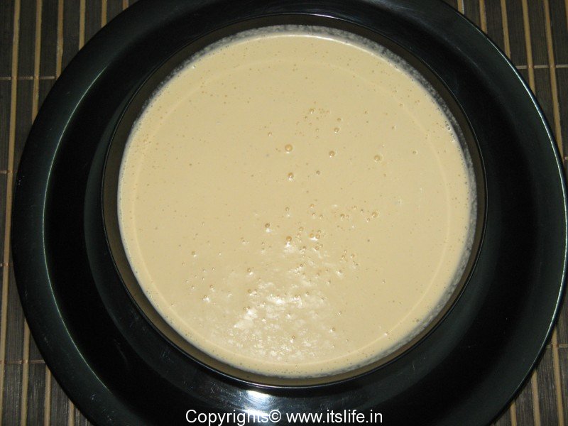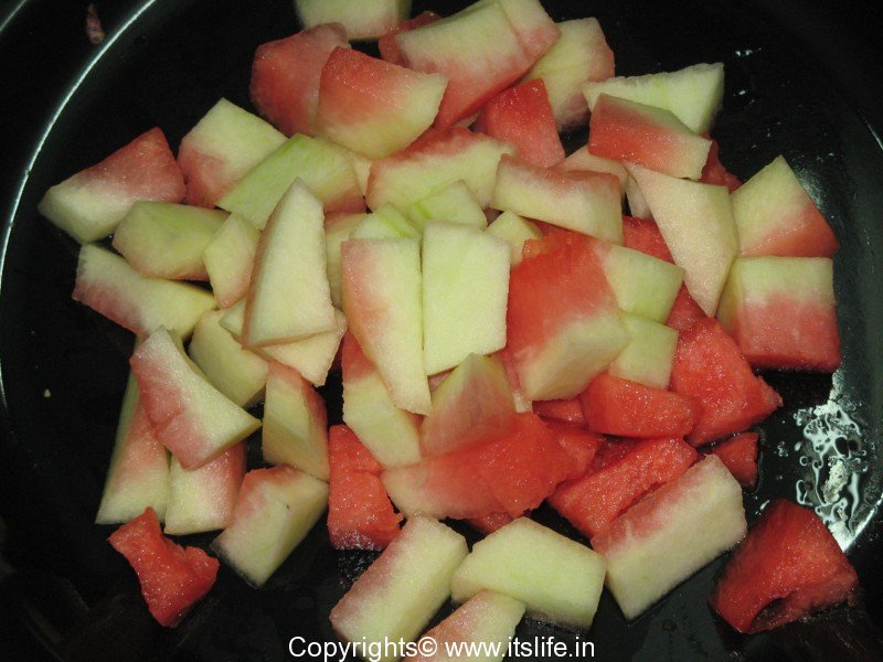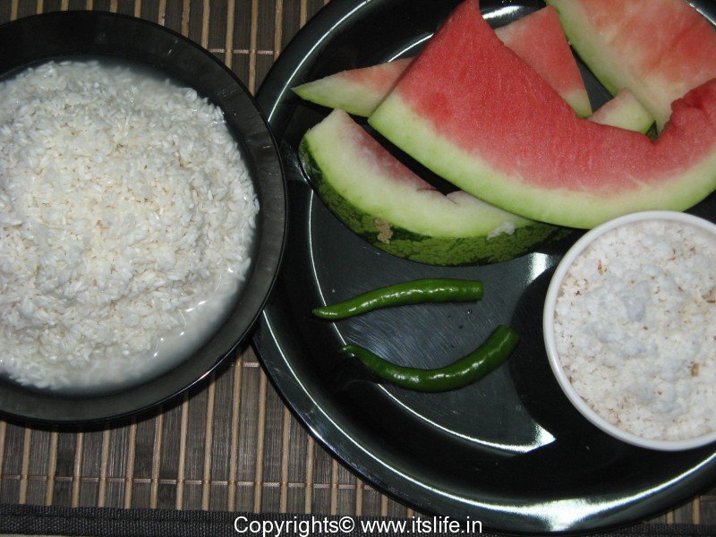 Soak Rice for 4 hours. Grind Rice with Watermelon, Coconut, and Green Chilies to a smooth batter.