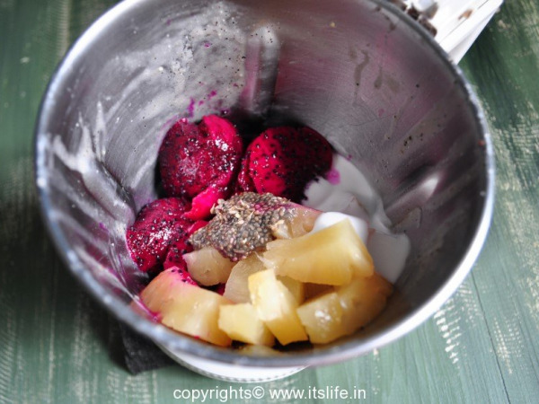 Scoop the Red-flesh Dragon fruit and combine with other fruits, Coconut milk, and Chia seeds and blend to form a semi-liquid. Keep it aside.