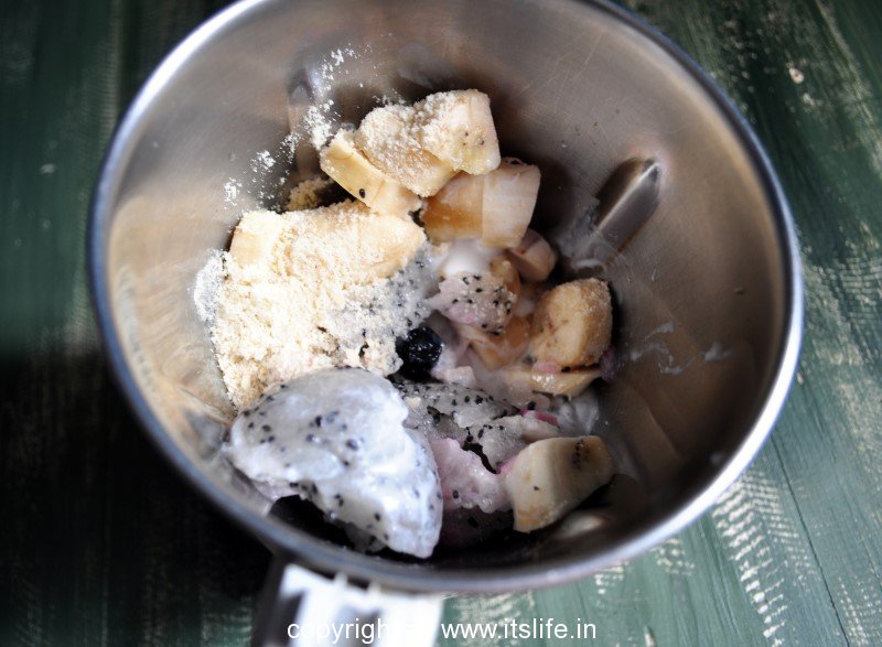 Scoop the White-flesh Dragon fruit, peel Banana and chop. Combine the fruits and Coconut milk and blend to form a semi-liquid. Keep it aside.