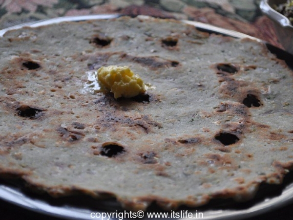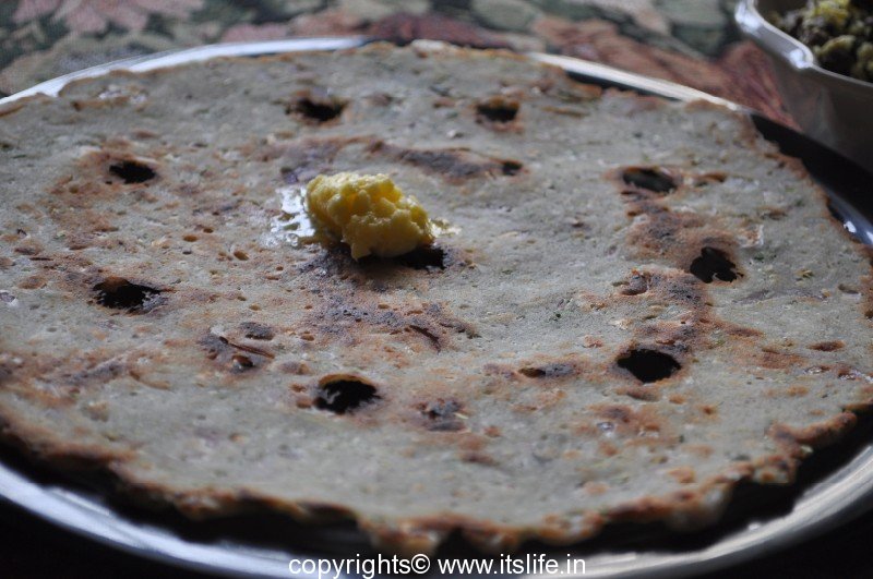 Make few holes here and there so that the rotti/bread does not puff up. Now sprinkle a teaspoon of Oil over it and roast it until done. Remove and cool the tava before preparing the next one.