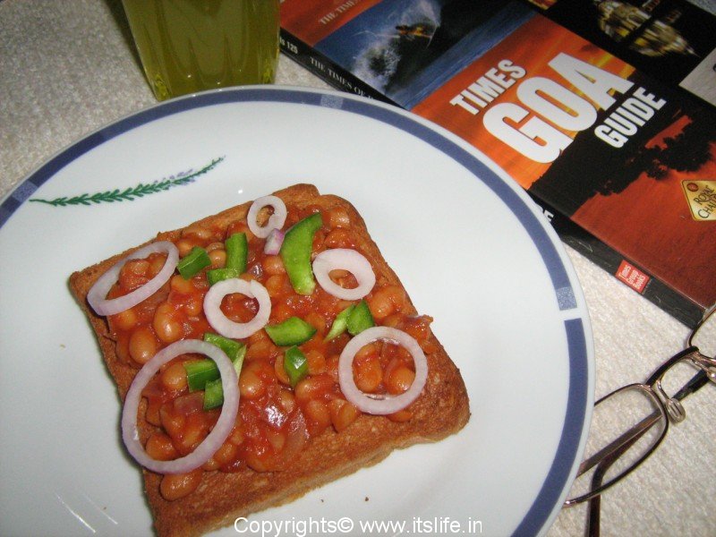 In a pan heat Butter/Olive Oil and add Onions and Garlic and sauté. Add Green Chilies and Baked Beans mix well and cook for 2 minutes. Toast Bread. On each toast spread a layer of Beans and garnish with Onion rings, Capsicum and Coriander leaves and serve