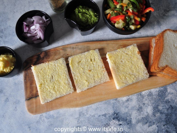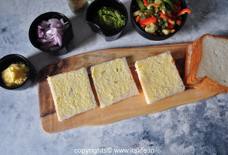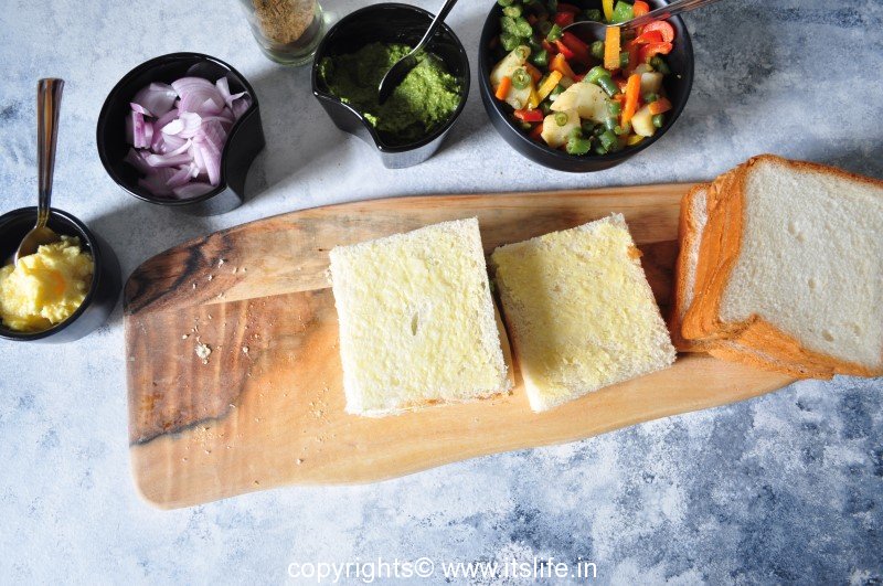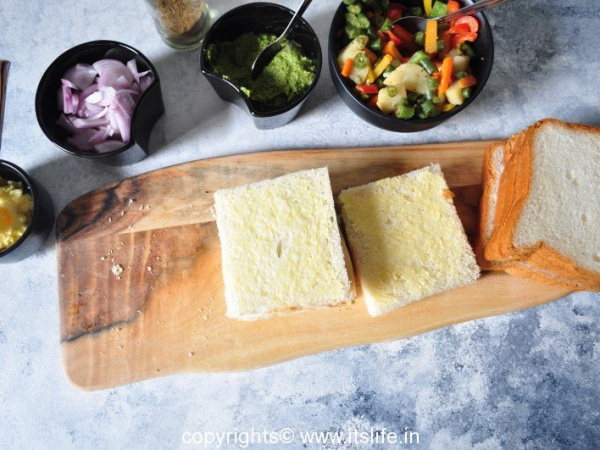 Apply butter on two slices of bread.