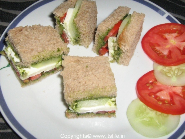 Remove the edges of the bread slices. Apply a thin layer of Pudina chutney on two slices of bread. Arrange Tomatoes, Cucumber, Onion and Paneer slices over the chutney. Close with the other bread slice. Serve Chutney Paneer Sandwich with Tomato Kethup.