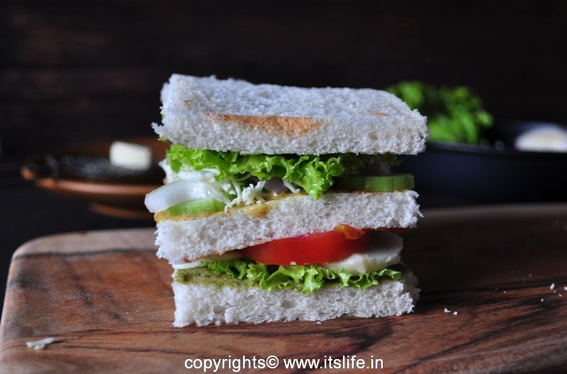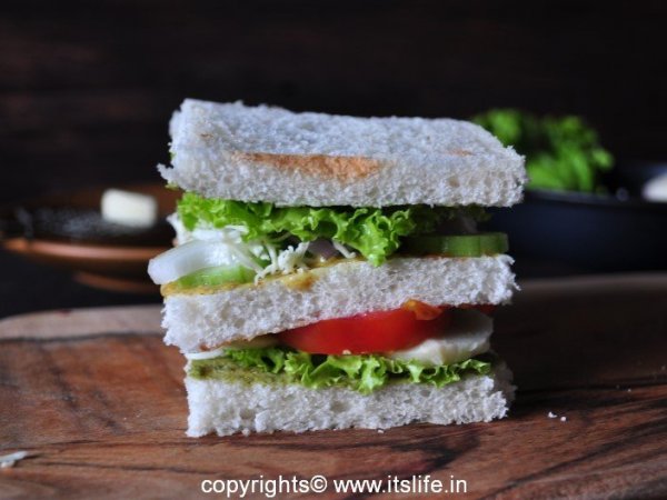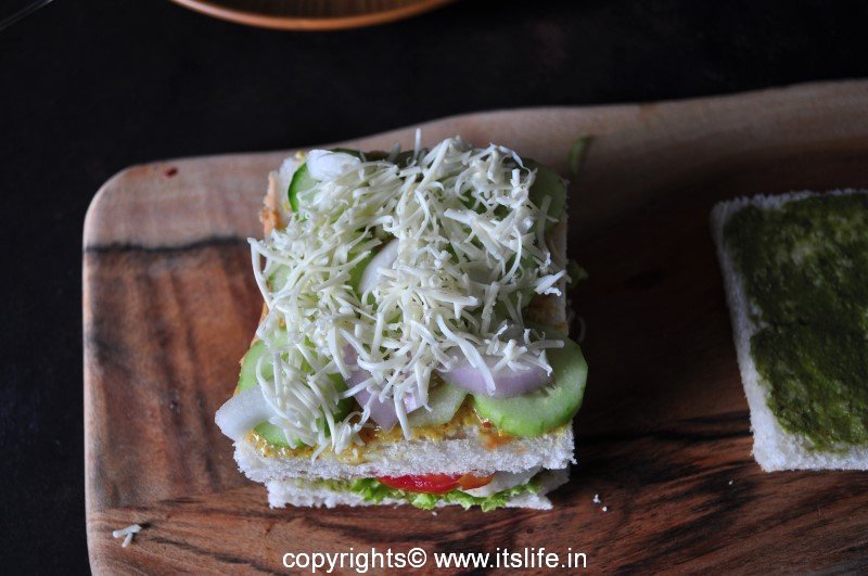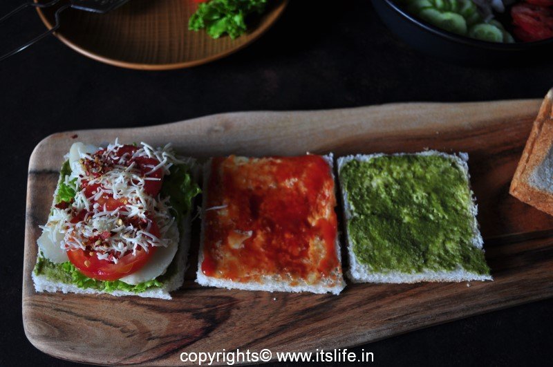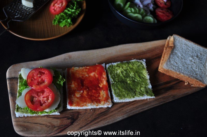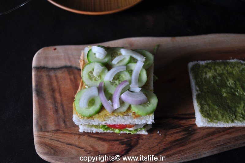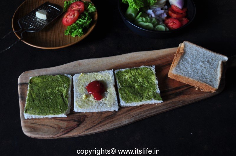 Bread slices can be lightly toasted or used as it is. Spread Butter and Mint chutney on two Bread slices.