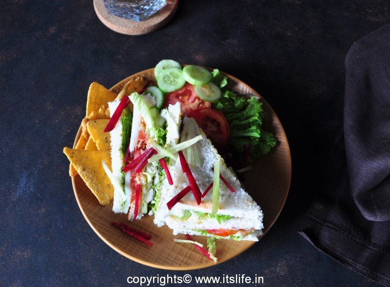 Press the sandwich and cut the brown edges and cut into desired shapes. Arrange the Club Sandwich in a serving plate and garnish with Cabbage/Lettuce and Beetroot shreds.