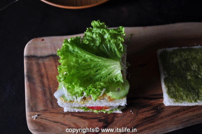 On the Mint chutney spread bread slice arrange Lettuce leaves and over it arrange Tomato, Potato and Cucumber roundels.