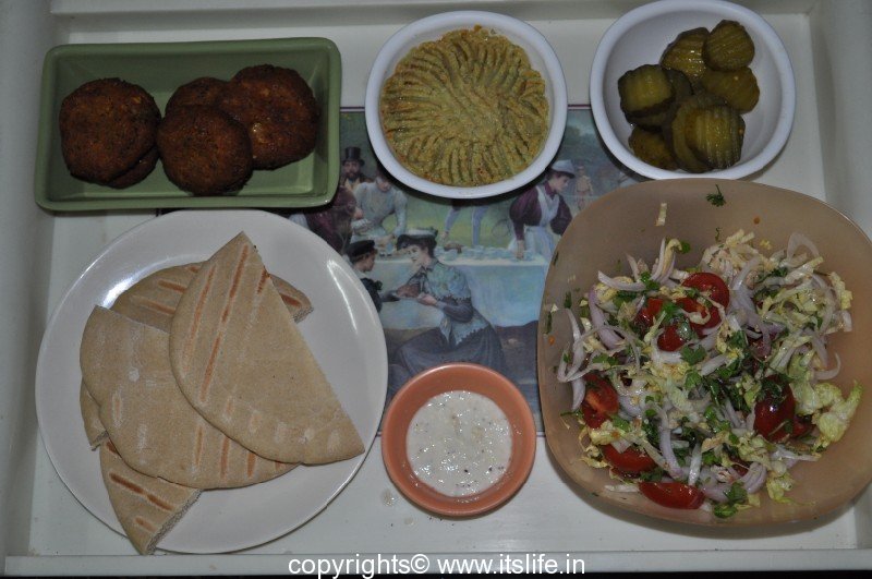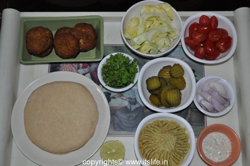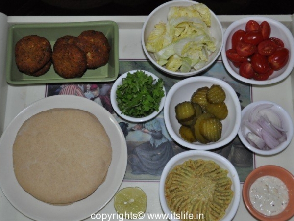 Halve the Pita Bread. Grill and keep aside. In a Salad bowl, mix Tomatoes, Zucchini, Lettuce, Onions, Coriander leaves, Lemon, and Salt and keep aside.
